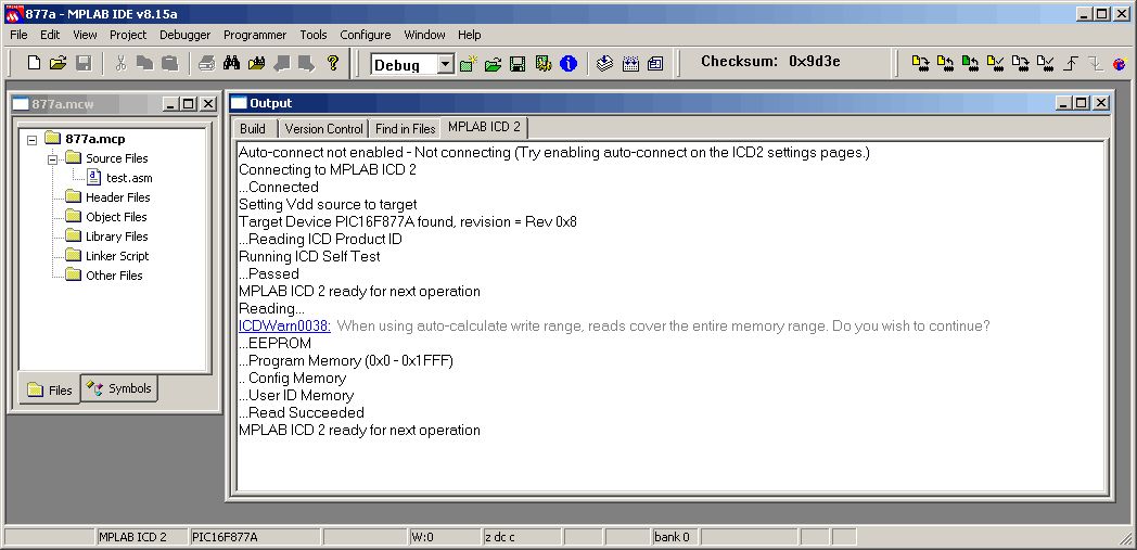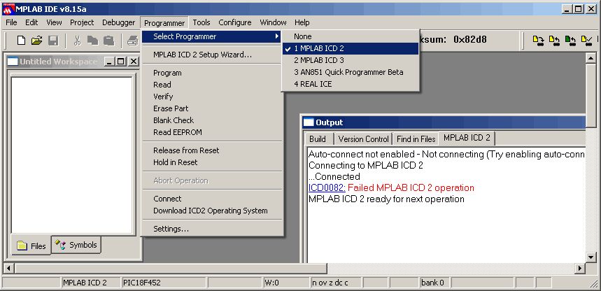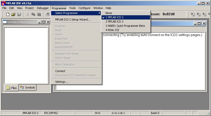 Tja, da ist genau der Haken! Wie geht das? Ich hab das Teil an MPLAB angesteckt und wähle unter Debugger den ICD2 aus, dann auf "connect" und da sagt er dann: "ICDWarn0054: MPLAB IDE has lost communications with the MPLAB ICD 2. Would you like to attempt to reconnect?" Weiter hab ich´s noch nicht geschafft...