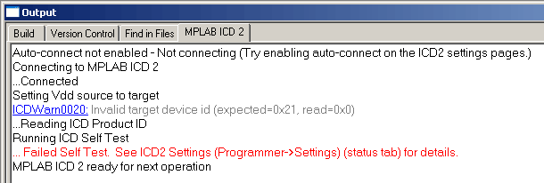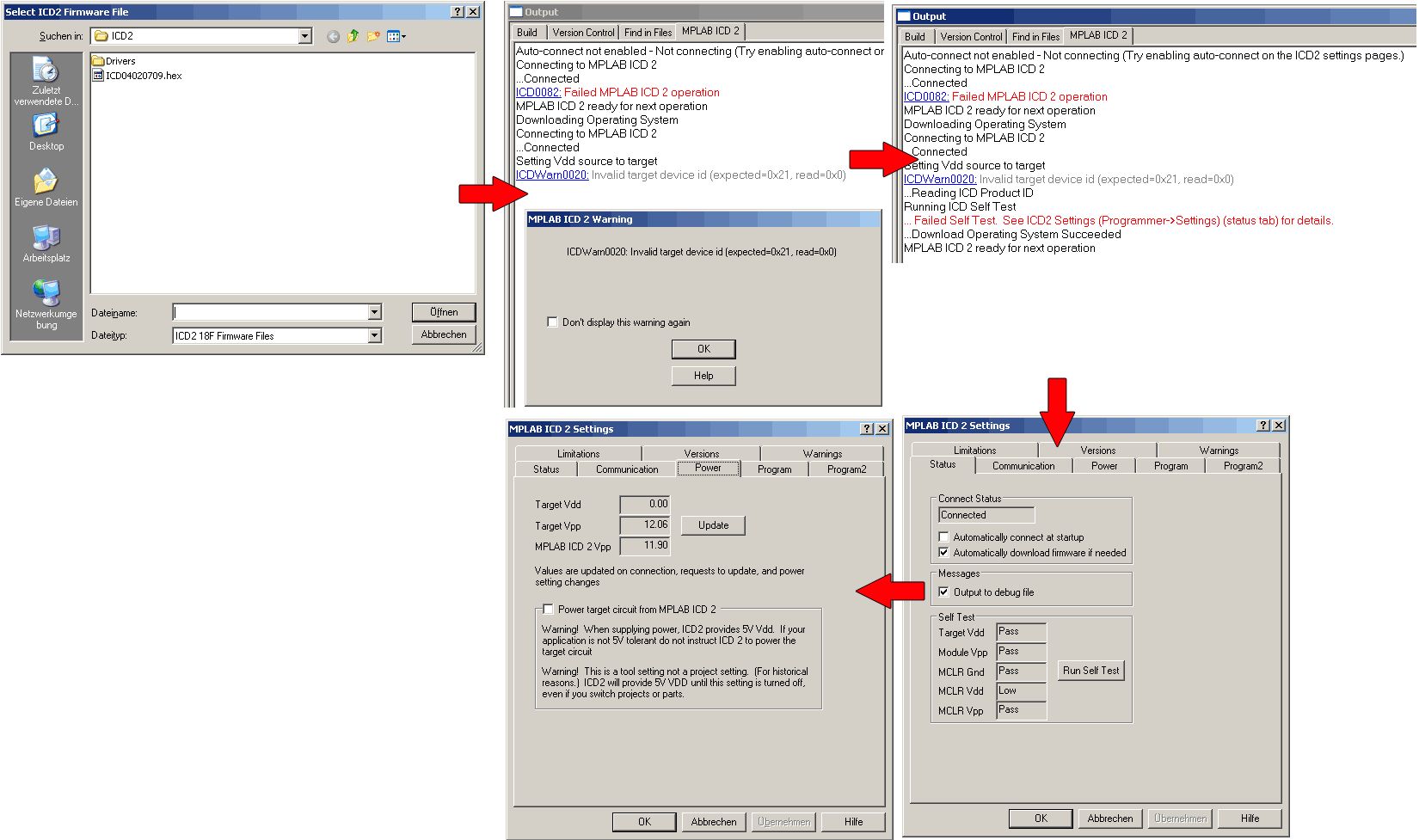 Jetzt schon ;) Was ich gemacht habe: Programmer --> Select Programmer --> MPLAB ICD 2 Programmer --> Connect (wie im letzten Beitrag) Programmer --> Download ICD2 Operating System Fenster: Select ICD2 Fireware File --> ICD04020709.hex Fenster: ICDWarn0020: Invalid target device id (expected=0x21, read=0x0) (alles auf einem Slide im Anfang) Danach leuchtet LED ISP-VDD auf... Erfolgreich, oder nicht? Hab mich im Thread noch ein bisschen umgeschaut und bin auf diesen Post gestossen: > Timo Engelmann - 19.03.2008 21:26 > [...] > Beim SelfTest wird MCLR Vdd mit Low angegeben, deshalb schlägt wohl > der SefTest auch fehl. Ist das korrekt, wenn ich den ICD2 ohne > Target betreibe? Folgepost: > Willivonbienemaya - 19.03.2008 23:16 > Das ist korrekt, weil das die Spannung ist die dein Target hätte. Also alles i.O?