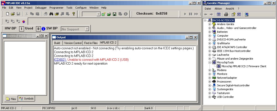 So, nun hab ich das ganze noch an einem anderen Rechner getestet. Hier geht es genauso nicht, aber es gibt eine andere Fehermeldung: Connecting to MPLAB ICD 2 ICD0019: Communications: Failed to open port: (Windows::GetLastError() = 0x0, 'Falscher Parameter. ') ICD0021: Unable to connect with MPLAB ICD 2 MPLAB ICD 2 Ready Hmm, keine Ahnung woran es liegt. Gibt es einen ICD2 Nutzer im Raum Heilbronn? Dann könnte ich vielleicht mal testen ob es ander Software Konfiguration oder doch an der Hardware liegt. Grüße Timo