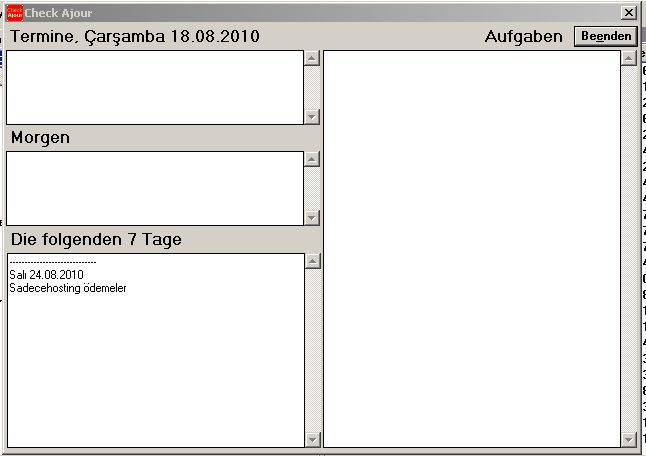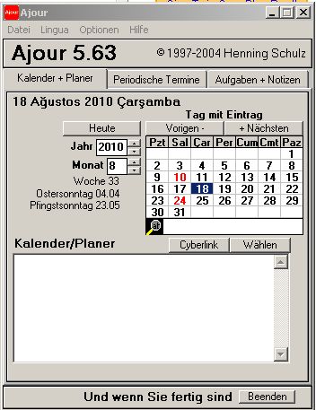 Für Notizen und Termine verwende ich: Notizen Cuecard: http://www.mhst.net/cuecards (die Freeware Version) Termine Ajour: http://www.micro-sys.dk (Freeware) Ajour ist für bescheindene Ansprüche echt sehr praktisch: Bei jedem Neustart des Rechners meldet ein PopUp die heutigen Termine, und die Termine der naechsten 7 Tage. Auch braucht man periodische Termine wie Geburtstage nur einmal einzutragen. Ich haeng' mal ein paar Bilder an. MfG aus Istanbul