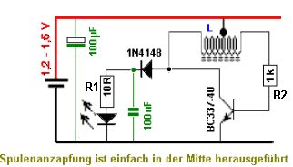 Hi, ich habe diesen angehängten Plan nachgebaut. Als Spule habe ich einen Ring von einem geschlachteten motherboard genommen, grün/blau, Durchmesser 12mm, Höhe 6mm. Da drauf 15 Windungen CuL 0.5mm, dann Schleife raus, und 15 Windungen weiter gewickelt. Multimeter sagt: 6,5V. Also habe ich 2 LED weiss in Reihe mit 15R Vorwiderstand angehängt. Funktioniert super. Dann habe ich die Ampere gemessen und da kommen 150mA raus - das ist nicht gut weil zu viel. Kann mir bitte jemand sagen: Wie stellt man am besten die Sache so ein, dass man nur z.B. 40 mA rauskriegt (wenn geht ohne dass die Volt einbrechen) und möglichst wenig Strom verschwendet wird? lg Triti