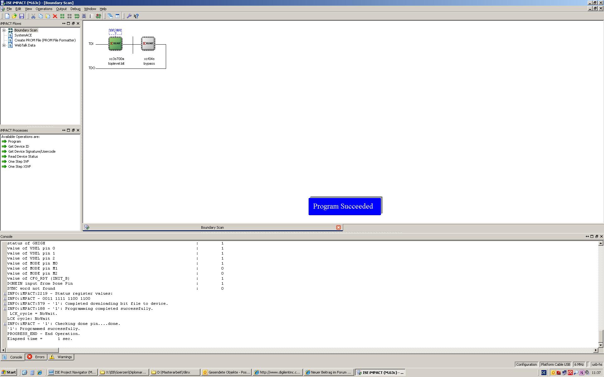 Hallo, ich verwende XILINX ISE 12.2, habe ein kleines Testprogramm(Binärzähler) geschrieben, auf Spartan 3a geladen, funktioniert einwandfrei. Nun will ich es in den Speicher schreiben, damit beim Anschalten des Boards die Konfiguration automatisch geladen wird. Wie geht das bei ISE 12.2? Irgenwdwie sehe ich im Impact nicht die Einträge die es in früheren Versionen gab, z,B. Direct SPI Konfiguration oder ähnliche. Ich finde in der 12.2 nur folgende Einträge wie im Screenshot om Anhang. Die große Frage wie bekomme ich das mcs-file in den AT45DB161D auf dem board? Gruß, Holger