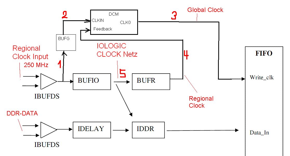 Christian R. schrieb: > Also PLL gibts im Virtex 4 ja nicht. Nimm einen DCM gebe ich dir recht, aber die PLL ist ein Bestandteil des DCM Christian R. schrieb: > An dessen Ausgang einen BUFG aktivieren > und dann landet der Input CLK auf einem globalen CLK-Netz. Der V4 hat ja > genügend. ich hatte das ganze auch so ähnlich vor - siehe Skizze im Anhang. Der DCM sollte mit dem DDR-Clock über einen BUFG und den IBUFDS mit dem DDR-Clocks versorgt werden (Leitung 1 und 2) -> das funktioniert auch schon. Der Ausgang des DCMs landet ja automatisch auf dem Global Clock Network... wie gewollt. Um die verschiedenen Signalverzögerungen zu kompensieren hätte ich gerne das Ausgangssignal (Leitung 4) der IO Logic genommen und dieses dem DCM als Feedback gegeben, so dass er die 250 MHz in Phase generiert... und gerade das funktioniert nicht... Das ist doch ein intelligenter Ansatz?? Warum funktioniert er aber nicht??