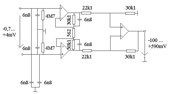 >Am Eingang und den Rückkopplungszweigen der Eingangs-OVs sind >Kondensatoren mit ziemlich kleiner Kapazität angebracht. Die sind ungewöhnlich groß! >Aber angenommen, ich würde selbst so eine Schaltung entwerfen wollen, >wie berechne ich die? Oder nehme ich einfach irgendwelche im >einstelligen Nanofarad-Bereich? Die bilden einen Tiefpaß mit der Grenzfrequenz von rund 1/2/pi/R/C, in deinem Fall also rund 780Hz. Das Problem dieser Kondensatoren dort ist, daß jegliche Abweichung zwischen den "Zwillingen" die Gleichtaktunterdrückung zerstört. Deswegen filtert man dort lieber weniger und verschiebt das auf hinter dem Instrumentationsverstärker. Außerdem dürfen hier nur absolut langzeitstabile und engtolerierte Kondensatoren zum Einsatz kommen, also Styroflex-Kondensatoren beispielsweise. >Und wofür sind die Megaohm-Widerstände und die Kondensatoren gegen >Masse? Aus den Eingängen des Instrumentationsverstärkers fließen immer Ströme. Denen mußt du einen Pfad nach Masse zur Verfügung stellen, sonst driftet die Spannung dort weg, bis sich der OPamp dann irgend wann verabschiedet. Kai Klaas
