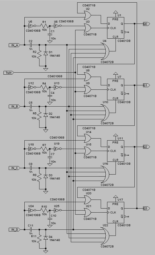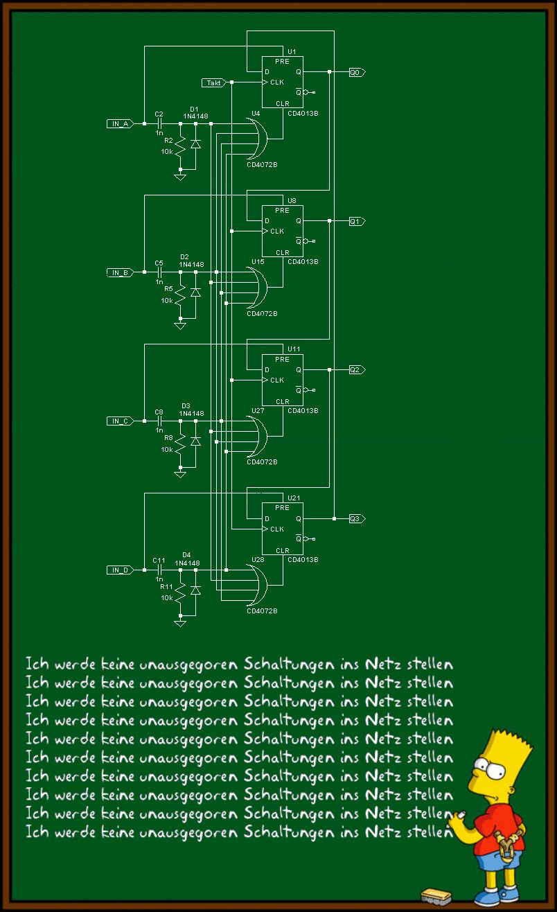 Ne passt ned :-(((( So ich glaube ich habe mich da falsch ausgedrückt, ich brauche kein schieberegister sondern so ne art laufschaltung. Ich erkläre es nochmals, wenn z.b. am eingang (signal) ein signal anliegt soll die schaltung auf den gleichen ausgang UMSCHALTEN. Beispiel, signal auf c und ausgang c ist auf high, danach signal auf b und am ausgang b ist ein high…. Usw….. wenn aber am takteingang ein signal kommt dann soll die schaltung die ja in unserem beispiel jetzt auf b steht weiter auf c springen und bei einem weiteren signal dann auf d. wenn aber wieder ein signal z.b. auf c kommt dann auf c springen. Kurz gesagt quasi ein 4 fach umschalter der aber auch bei takteingang wie ein lauflicht weiter springt. Ich hoffe ist so verstanden worden…. Bitte eine lößung mit plan… ,es muss nicht unbedingt mit dem 4013 sein.... DANKE