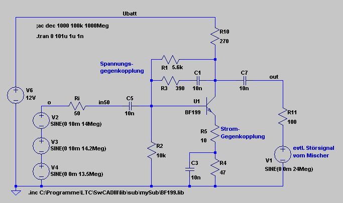 Hallo Andreas Der NE612 hat einen Eingangswiderstand von 1,5k. Den kannst Du ruhig hinten dranhängen, auch wenn der Verstärker einen niederohmigeren Ausgang hat. Da kommt mir eine andere Idee, wenn Du nur den Übertrager dranhängst und die 50 Ohm der Antenne an die 1,5k des NE512 anpasst, wäre das auch schon die 5-fache Spannung. Mehr würde ich vor dem NE auch nicht machen, sondern dahinter. Deine Schaltung funktioniert jetzt im Prinzip, dein Kollektorwiderstand erscheint mir noch zu hochohmig und der Ruhestrom mit 5mA zu niedrig. Der Arbeitspunkt am Kollektor sollte bei ca. der halben Betriebsspannung (6V) liegen, was bei Dir jetzt einigermaßen passt. Mein Schaltungsvorschlag zum rumspielen: ~~~~~~~~~~~~~~~~~~~~~~~~~~~~~~~~~~~~~~~~ Der Eingangswiderstand wird hauptsächlich beeinflußt von R1, R3 und R5. V(in) muß gegenüber V(o) die Hälfte betragen. Der Ausgangswiderstand wird beeinflußt durch R5, R10 und dem Arbeitspunkt des Transistors. Für 50 Ohm Ausgangswiderstand wäre ein Ruestrom von ~ 50mA notwendig oder ein Ausgangsübertrager. Ich selbst habe deshalb für mich beschlossen, meine Geräte intern in 100 Ohm auszuführen. Die Verstärkung kann mit R1, R3, R5 und R10 variiert werden. Denk daran, die Spannung V(in) ist die Eingangsspannung, nicht jene direkt an der Signalquelle. Die Änderung eines Bauteiles wirkt sich üblicherweise auf mehrere Eigenschaften der Schaltung aus. Nach jeder Änderung (außer R3) erst den Arbeitspunkt kontrollieren. Übersteuern kannst Du den Verstärker mit einem Eingangssignal an V(in) von > 400mV eff. Sieh Dir dazu auch das Spektrum des Ausgangssignals an. Vor allem der Betrag der 2. Oberwelle (42Mhz) steigt stark an. Kreuzmodulation Beaufschlage die Schaltung mit 2 unterschiedlichen Frequenzen gleicher Amplitude, z.B. 10mV, und laß Dir das Spektrum anzeigen. Erhöhe die Amplitude auf 100mV. In welchem Abstand bilden sich Mischprodukte und wie ändern sie sich mit der Amplitude. Könnten sie Dein Nutzsignal stören? Rückwirkung Beaufschlage den Ausgang des Verstärkers mit einer Oszillatorfrequenz. Schau Dir den Peak bei V(in) an. Falls zu viel zur Antenne zurückwirkt, wirst du unbeabsichtigt zum Störer. Erlaubt wären 5nW = -53dBm an der Antenne, was bei 50 Ohm 0,5 mV entsprechen würde. Gruß, Bernd