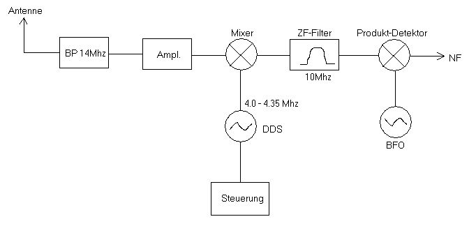 Hallo Andreas Dürften wir etwas mehr über Dein aktuelles Konzept erfahren? Du schreibst über deinen DDS, das 14Mhz Filter usw. aber wie ist das geplant und was hast Du schon fertig. Welche Art von Mixer planst Du zu verwenden. Davon hängt dann ab, wie der Verstärker bemessen werden sollte. Hängst du z.B. den SA612 dahinter, würde ich keinen zusätzlichen Verstärker verwenden, da dieser das Signal schon selbst um 17dB anhebt und leicht übersteuert werden kann. Kommt ein Dioden-Ringmischer dran, dann solltest Du mit 7~15dB verstärken und auf Rückwärtsdämpfung achten, damit Du die DDS-Frequenz und andere Mischprodukte nicht über die Antenne abstrahlst. Gibt es schon ein ZF-Filter und mit wieviel Dampfung rechnest Du dafür? Diese Dämpfung könnte evtl. bei obigem Vorverstärker gleich einberechnet werden. Möchtest Du den Empfänger möglichst einfach halten oder soll er Qualitativ nahezu mit kommerziellen mithalten können? Bernd