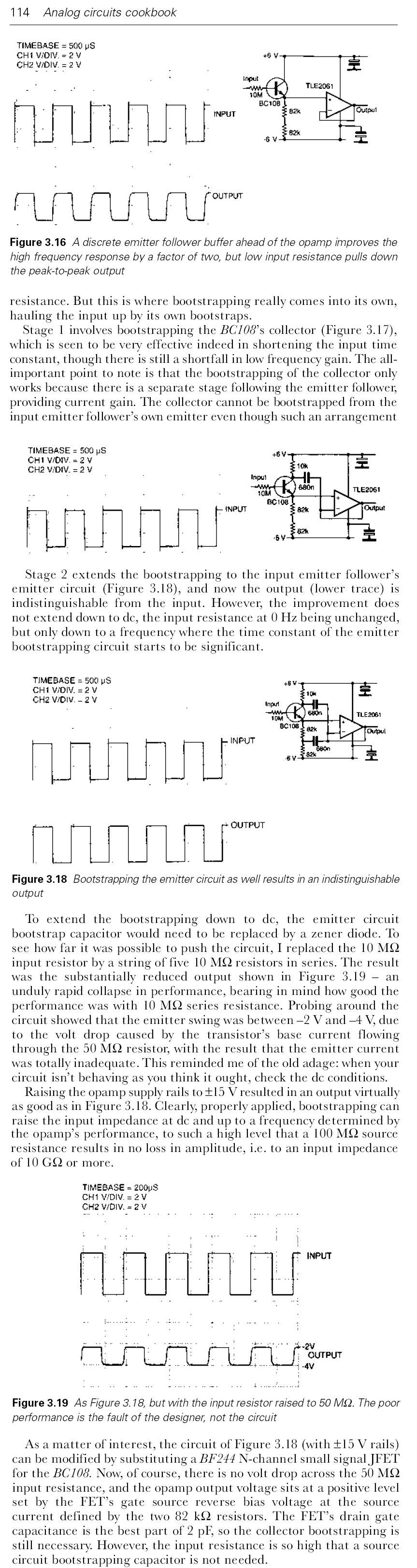 @ Jörg Wunsch >DC mit dem aktiven Tastkopf ist ja ohnehin etwas unhandlich, damit der >Transistor immer schön im Arbeitsbereich bleibt. Ja, das war auch eine der Gründe warum ich nicht eine dieser oben geposteten HP/Tek Schaltungen genommen habe. Die haben für meine Feld-Wald-Wiesen Einsatzzwecke einfach einen viel zu kleinen linearen Aussteuerbereich. z.B. die P6201 hat im 1x Modus +-0.6V und im 10x Modus +-6V. Bei mir sinds bei 10x mehr als +-12V. Dami kann ich bedenkenlos an alles ran was so auf meinem Experimentiertisch rumflackt - macht das Leben viel einfacher. @ branadic >> Den Trick mit dem Input C Bootstrapping wollte ich bei Gelegenheit auch >> nochmal ausprobieren. > >Müsste man sich mal näher anschauen. ... hier noch etwas Theorie dazu.