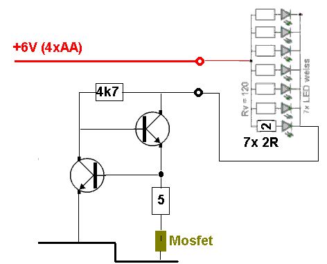 Hi, vielleicht kann man mir hier sagen ob... Ich hänge das Bild an. Ich habe eine Schaltung (monoflop) auf 6V (4xAA). Daran hängen 7 LED, jede mit 150R Vorwiderstand, ich brauche also 140mA. Die LED werden langsam auf und abgedimmt wenn der Mosfet schaltet, dazwischen bleibts 4 Minuten ganz hell. Das funktioniert. Transistor: 2x BC337-25. Damit das ganze aber gleich hell bleibt bis 4,5V herunter will eine Konstantstromquelle dazwischen schalten und den Vorwiderstand bei den LED auf 2R damit sich der Strom aufteilt. Geht das so wie im Bild und passen die 4k7? Besser 1k? lg Triti