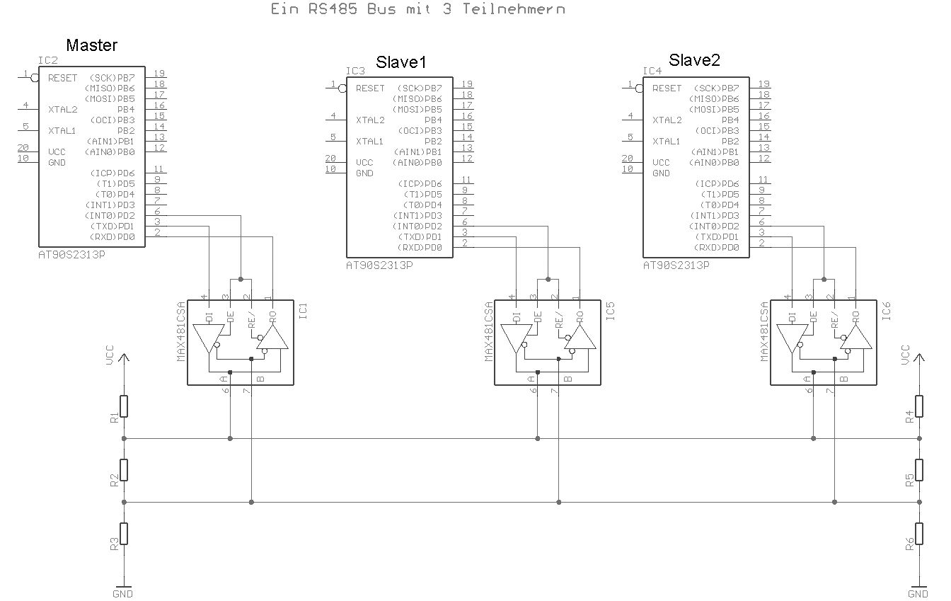 Hallo, ich verwende als Master einen FT232RL mit MAX485, als Slaves verwende ich ATTINY2313 mit MAX485. Nun versuche ich schon verzweifelt das hinzukriegen aber das will irgendwie garnicht. 2-Draht A,B,GND verbunden. Ich habe mich auch totgegoglt, laut diesem Schaltplan sind die SLAVES DI<->TXD und RO<->RXD verbunden stimmt denn das so? Beim SLAVE ziehe ich DE und RE/ auf 5V wenn ich Daten schicken will, aber das Teil will nicht was mache ich falsch? Danke schon mal.