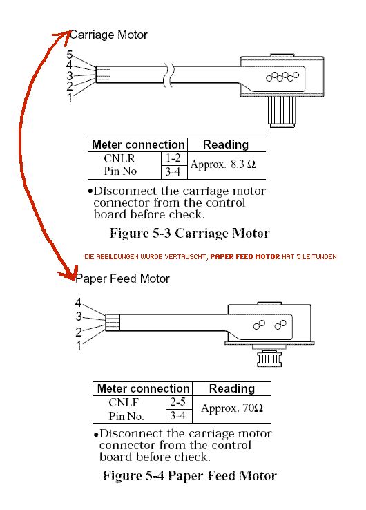 Tja...muss ich testen. Interessant ist, dass der Motor, der für Papiertransport zuständig ist an 2 ULN2003 angeschlossen ist (deswegen auch 5 Leitungen, 70 Ohm ) ( http://piese-imprimanta.ro/pdfs/1249_Canon%20BJC-50%20Service%20Manual.pdf) Seite 174, 5-34 es handelt sich anscheinend um solche Schaltung http://fred.unis.no/StampII3Mx/Default.htm ich bin gerade etwas irritiert - kann es evtl. doch sein, dass die motoren unipolar sind (wegen 6 pins)? auf dem Gehäuse der Motoren stehen zwar Kennungen, aber ich fand nichts im Web, vermute interne Bezeichnungen... blöd ist, dass im Service Manual nichts näheres dazu steht, die Manuals von Epson dagegen sind sehr detailiert... Papiereinzug > QH4-4206 B0420 Schlitten > QH4-4207 B0221