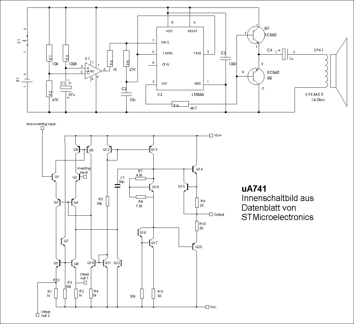 Ich habe da ein seltsames Phänomen. Umgekehrt als sonst, frage ich mich, warum etwas funktioniert. Bei folgender Schaltung handelt es sich um ein Gerät, was einen lauten Piepston von sich gibt, wenn man vergisst, das Kindersicherungstörchen an der Treppe wieder zu verschließen, nachdem man es zum Passieren geöffnet hat. Sie besteht aus einem uA741 Operationsverstärker als Komperator, um eine Einschaltverzögerung zu erzeugen, einem NE555 als Oszillator und einer Endstufe aus BC550/BC560. Hierbei handelt es sich um Bauteile, mit denen ich schon vor über 25 Jahren herumbastelte, und ich habe sie eher aus Sentimentalität und Nostalgie als aus irgendwelchen praktischen Gründen gewählt. Die Batterie ist eine 9V Block, der Schalter ein öffnender Mikroschalter, der durch das Schließen des Törchens betätigt (geöffnet) wird. So braucht die Schaltung im Ruhezustand keinen Strom. Unter den Schaltplan habe ich die Innenschaltung des uA741 eingefügt, um das mir nicht verständliche Phänomen zu erläutern. Ich hatte erst probiert, für die Einschaltverzögerung ebenfalls einen NE555 zu nehmen, bin dann aber an dem prinzipiellen Problem gescheitert, dass der NE555 nach dem Einschalten eine Trigger-Flanke braucht, um das Timing zu starten, was mir den NE555 für diesen Zweck ungeeignet scheinen lässt. Als ersten Schritt für einen Schaltungsentwurf mit einem ungetriggerten Zeitgeber habe ich dann diese Schaltung auf dem Steckboard aufgebaut, um das Entladen des Kondensators nach dem Ausschalten wollte ich mich dann im 2. Schritt kümmern. - Tja, und dann das: Der Kondensator entlädt sich in Sekundenbruchteilen nach dem Ausschalten von selbst! Das kann eigentlich nur über den nichtinvertierenden Eingang des 741 geschehen, denn zum Laden über R3 (in der Realisierung dann ein Trimmpoti) braucht er einige Sekunden. Im Innenschaltbild finde ich aber keinen Weg, den der Strom hier nehmen könnte. Q8 und Q9 sind PNPs, da fließt in die Basis nichts herein. Bleibt der Weg über Q1 und Q3, aus der Basis von Q3 zu Q10/Q11, kann da aber nicht weiter fließen, da Vcc ja 0V ist, und so vom Stromspiegel Q12/Q13 nichts kommen dürfte. Wer weiß des Rätsels Lösung?