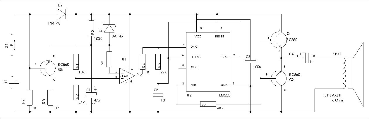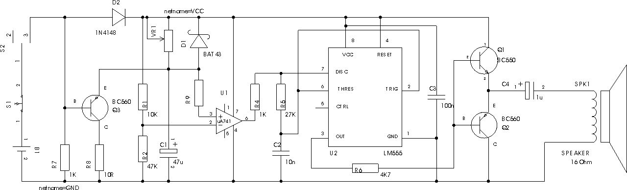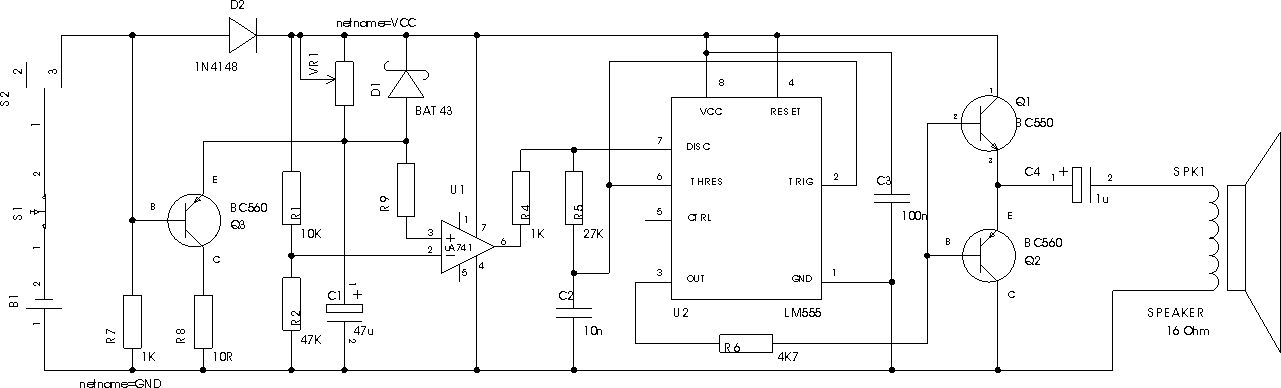 Wie gesagt, für die genannte Anwendung irrelevant. Aber was ist, wenn man eine Anwendung hat, bei der die Schaltung sehr schnell wieder betriebsbereit sein muss, es dabei auf identische Zeiträume ankommt, und ein weniger stromgefräßiger OP als der uA741 und ein sparsamerer Verbraucher als ein NE555-Oszillator mit einer Gegentakt-Endstufe und Lautsprecher verwendet wird?