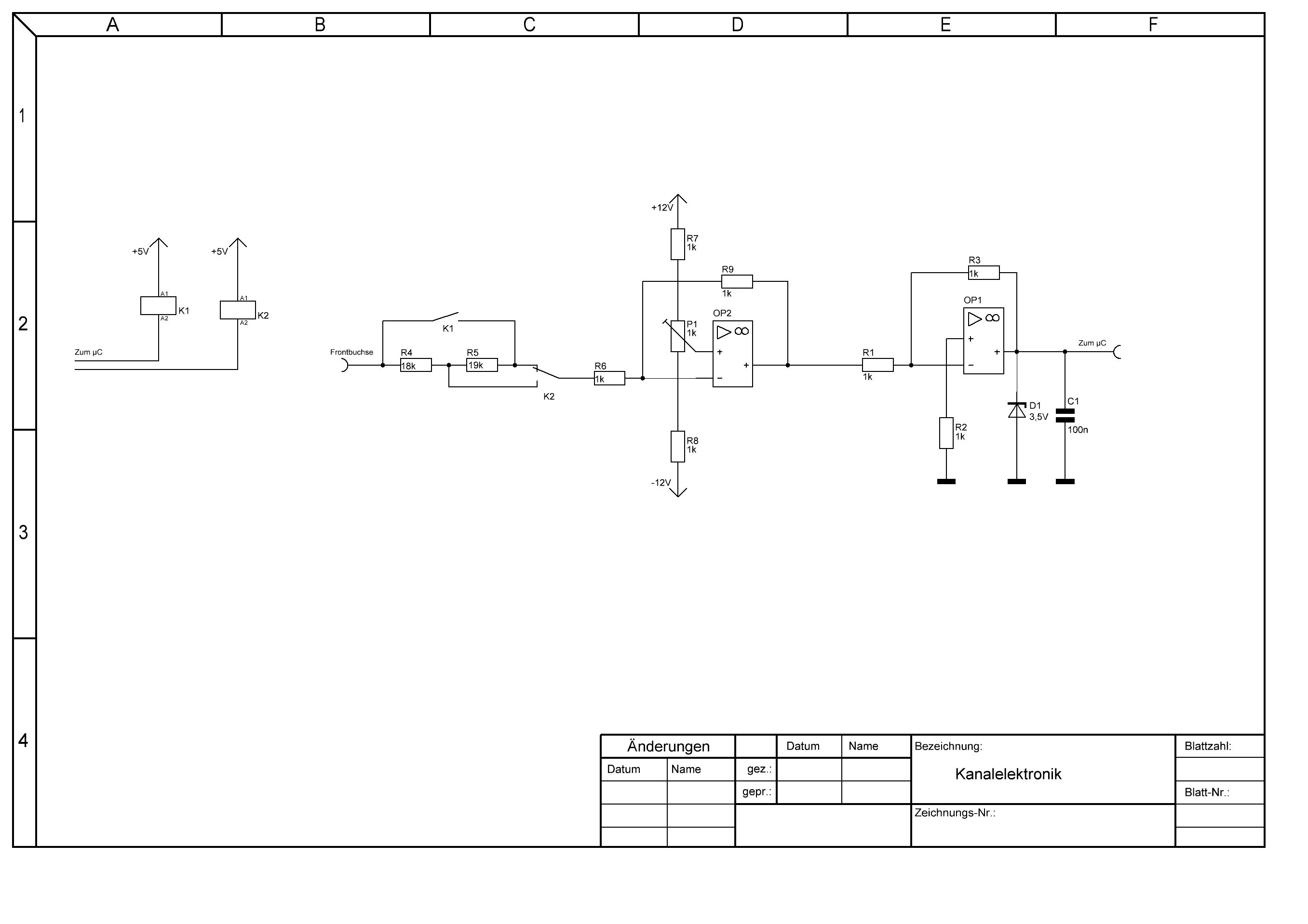 Hallo zusammen! Ich bin dabei mir ein "8-Kanal-Spannungsmessgerät" zu bauen. Herzstück ist ein ATmega16. Bisher besteht das Messgerät aus einem Gehäuse mit Netzteil (+12V, -12V, 5V), Display mit 2x20 Zeichen, einem Encoder (Impulsgeber) zur Menüsteuerung und einer Hauptplatine mit dem µC und RS232 anbindung. Das funktioniert auch alles schon recht gut. Da der Messbereich sich derzeit nur von 0 Volt bis zur Höhe der Referenzspannung von 2,56V erstreckt, möchte ich die DAC-Eingänge beschalten. Im Anhang ist ein Schaltplan, wie ich mir das gedacht habe. Vielleicht kann jemand ja mal drüber schauen, ob das so funktioniert. OP2 macht eine Abschwächung des zu messenden Signals. Durch K1 und K2 habe ich die Möglichkeit vier Messbereiche zu steuern. Durch R7, R8 und P1 verschiebe ich dir virtuelle Masse und damit quasi auch die Masse des zu messenden Signals. Dann kann der µC nämlich den gesamten Spannungsverlauf von -60V bis +60V erfassen und durch entsprechende Berechnung darstellen. (-60V entspricht 0x00 und +60V entspricht 0x3FF) OP1 buffert das Signal einfach noch einmal. D1 schützt den ADC vor Überspannung. So, das wars. Welche OPs ich genau einsetzten sollte, weiß ich noch nicht genau. Vielleicht hat da ja jemand noch einen Tipp für mich. Vielen Dank im Voraus! LG, Lukas.