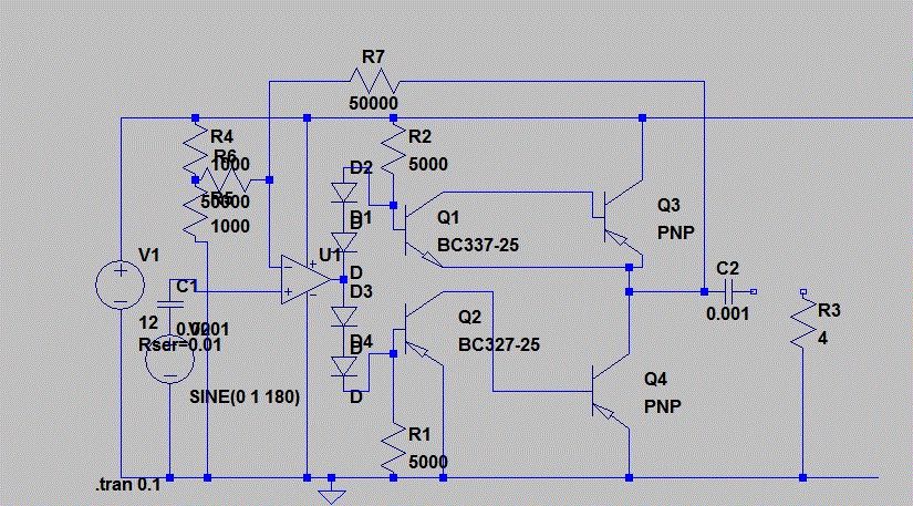 Erstens ersetzt man einzelne npn nicht einfach durch pnp, weil die ganz andere Polaritäten benötigen (nämlich genau andersherum, was Schaltungsmodifikationen nötig macht). Und zweitens kann die Schaltung selbst mit npn nicht funktionieren, weil die Endstufentransistoren gar keinen Basistrom bekommen können. Das sich überhaupt ohne Last ein Signal am Ausgang einstellt, liegt einzig und allein daran, weil das Signal des OPV sich über Schleichwege zum Ausgang durchmogelt. Die Endstufentransistoren sind an der Bildung des Ausgangssignals gar nicht (aktiv) beteiligt). Weiterhin stellt Q2 in Verbindung mit dem Diodenpaket am OPV-Ausgang keine sinnvolle Schaltung dar, selbst als npn nicht.