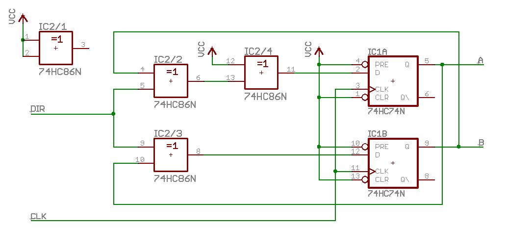 Hallo, Ich bin auf der suche nach einer Schaltung, das einen 2 bit Gray-Code erzeugen kann. Dieser soll einen Drehimpulsgeber ersetzen. Ich baue gerade ein Handrad für eine CNC-Maschine. Nun will ich zwei Tasten + bzw. - integrieren, die folgende Aufgaben haben sollen. Wenn ich eine von den Tasten + bzw. - drücke, soll meine Achse verfahren. Bei der verwendeten software istdies leider nicht möglich, so will ich meinen vorhandenen Drehimpilsgeber Hardware überbrücken und einen 2 Bit Gray Code erzeugen und mit den Tastern + bzw. - verbinden um so meine Achsen zu verfahren. nun zu meiner eigentlichen Frage, eigent sich die oben gezeigte Schaltung dazu oder nicht? Oder weiß von euch einer, wo ich einen Schaltung finden kann, die einen 2 bit Gray code erzeuegen kann? Bin für jede hilfe Dankbar