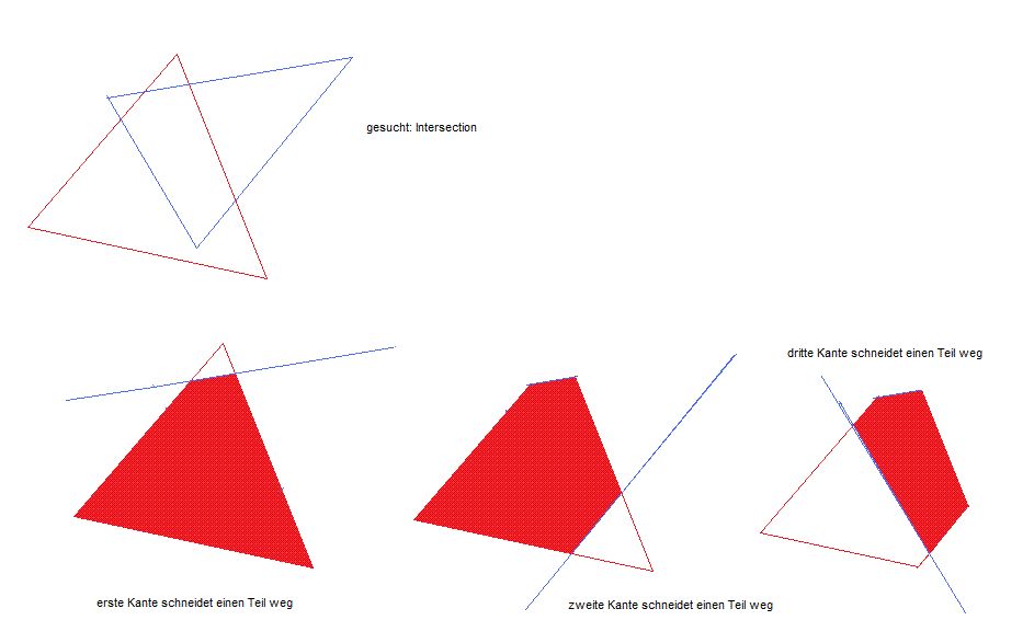 Noch eine Idee: Da ein Dreieck ja notwendigerweise konvex ist, könnte man auch überlegen ob man nicht ein allgemeinenes Clipping Verfahren dahingehend adaptieren kann. Clipping Verfahren wie sie zb benutzt werden, um Ausgaben in ein Grafik-Fenster auf den sichtbaren Fenster Bereich zurechtzuschneiden. Da gibts zb auch recht einfache Ansätze: Eine Gerade zerschneidet die Ebene in 2 Teile. Man nimmt nun das erste Dreick her. Vom 2-ten Dreieck nimmt man eine Kante (die ja eine Gerade ist). Diese Gerade schneidet das Dreieck irgendwo (oder auch nicht). Falls es zerschnitten wird, erhält man 2 Polygon (sonst nur eines). Mit der Geraden lässt sich nun jeder der beiden Einzelteile klassifizieren auf welcher Seite der Geraden er liegt: innerhalb oder ausserhalb des 2.ten Dreiecks, wenn man nur diese eine Kante in Betracht zieht. Uns interessiert nur der Teil innerhalb. Mit dem gehts weiter Dasselbe macht man mit der 2.ten und 3.ten Kante des 2te Dreiecks. Nach jeder Operation bleibt nur der Teil des ersten Polygons übrig, der von dieser Kante aus gesehen, auf der richtigen Seite liegt, so dass er innerhalb des Dreiecks liegt. -> sind alle 3 Kanten abgearbeitet, bleibt ein Polygon übrig, welches den 'sichtbaren' Teil des ersten Dreieck im zweiten repräsentiert - die Intersection