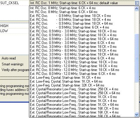 Wenn man nicht weiß, welche Werte einzustellen sind: Start-up-Zeit, immer wenn nicht ausdrücklich notwendig, auf die längste Zeit einstellen. Quarzfrequenz auf höchste Frequenz, da ist die Schwingfreudigkeit am größten. CKOPT auf Eins stellen, das bringt die größte Schwingamplitude. Dann schwingt der Oszillator auf jeden Fall. Vielleicht wird dabei der Oszillator/Quarz übersteuert, das ist aber im Moment nicht so wichtig. Wenn man Strom sparen will oder andere Gründe hat, kann man sich anschließend an die Feinarbeit machen.
