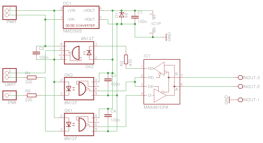 Bei den 6N137. Pin 7 würde ich auch auf VCC hängen. Pin 6 des 6N137 (Ausgang) ist "open collector". Also fehlen da noch die Pull-Up Widerstände. Falls du noch RDM damit machen willst, fehlt da noch das bias network. ( Am MAX : 130R zwischen pin 6 und 7, 560R zwischen pin 7 und GND, 560R zwischen pin 6 und VCC)