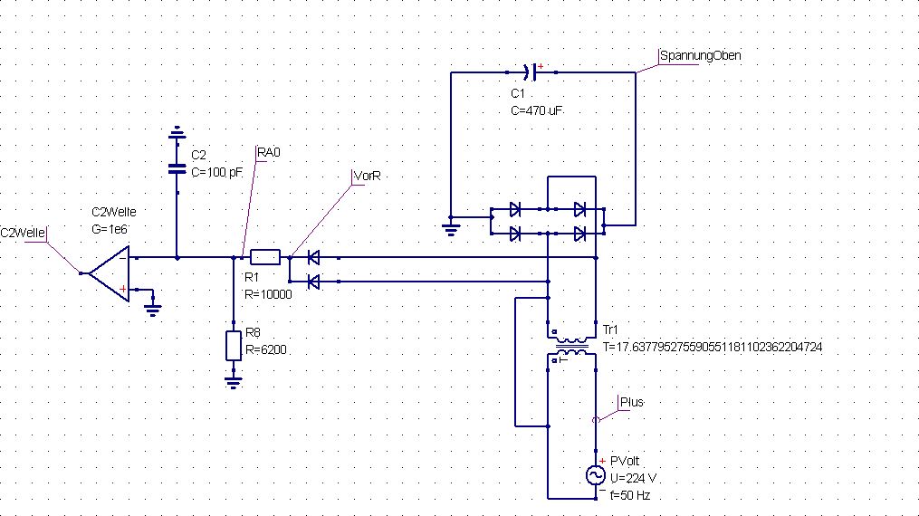 Lothar Miller schrieb: > Welche Bauteile hast du in der Realität verwendet? Der Komparator ist in einem PIC 16F628, Dioden sind Standard-Niedervoltdioden. Trafo ist ein 230V AC -> 9V AC Printtrafo, ansonsten 1/4 Watt Widerstände.