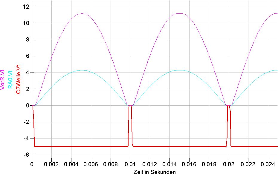 Helmut Lenzen schrieb: > Da der Komparator mit seinem + Eingang auf Masse liegt kann er nicht > schalten. Dein Signal wird ueber 2 Dioden ja gleichgerichtet und kann > folglich nur postiv sein. Das heist aber fuer den Komparator das sich > das Potential an seinen Eingaenge immer nur in einer richtung bewegt. > Leg mal den + Eingang auf ein positives Potential von ungefaehr die > haelfte deines Signales. Wenn das so wäre, wie erklärst du dir dann die Simulation?