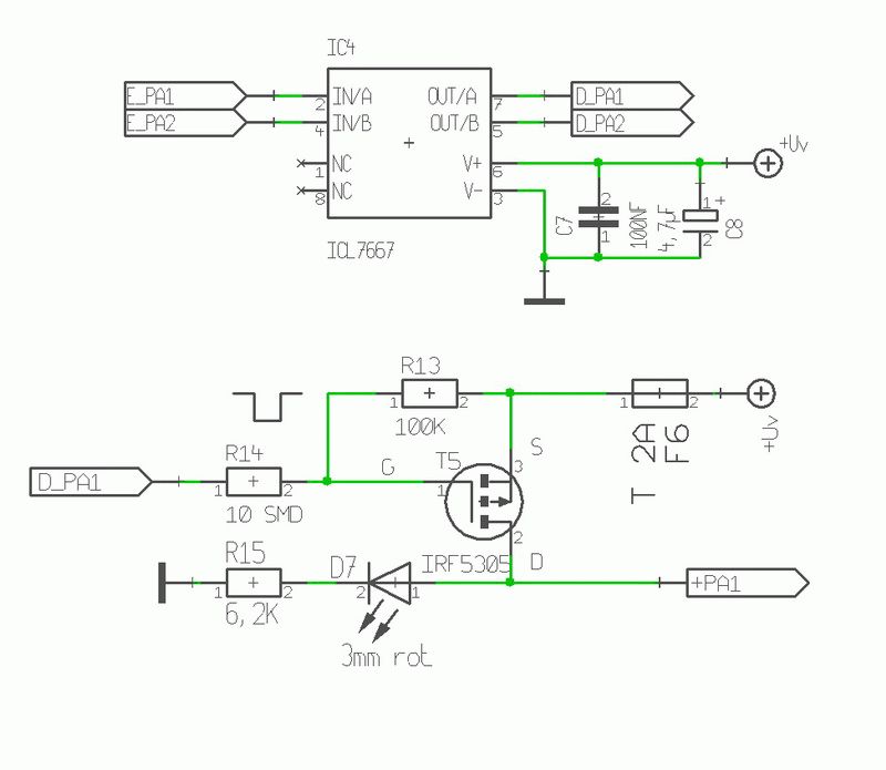 > Reden wir aneinander vorbei? Viellieht. Du fragtest, ob der gezeigte Treiber NOTWENDIG ist. Also gehe ich davon aus, du möchtest gerne D_PA1 direkt an den uC legen. Und das geht halt nur über einen Transistor als Pegelwenadler +Uv | | 470R | | |S +--------|I IRF5305 | | uC --1k--|< BC547 |E GND MIT Pegelwandler geht es natürlich auch, aber das war doch wohl nicht deine Frage, dachte ich mir. Richtig ist, daß es ziemlich merkbefreit ist, er einen niederohmigen MOSFET-Treiber zu kaufen, und ihn dann mit einem extra Widerstand auszubremsen. Den 100k braucht man auch nicht, es sei denn, man rechnet mit abfallendem Zuleitungskabel.