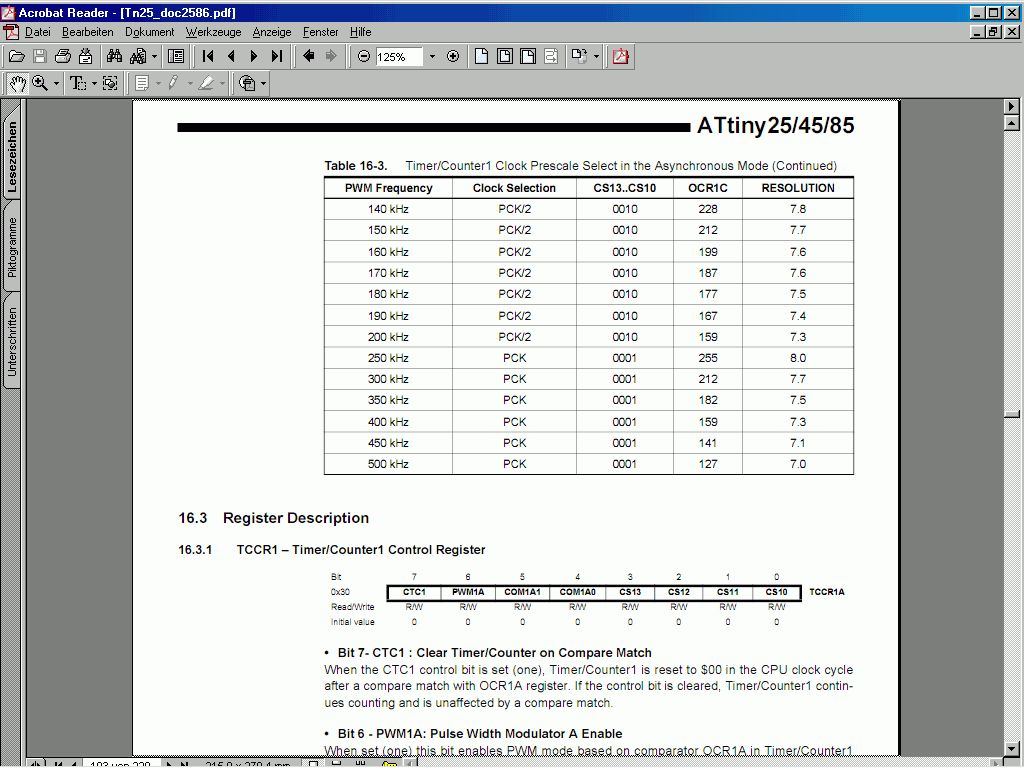 Hallo, wenn ich das CTC1 Bit im TCCR1 eines ATtiny85 setze, springt das Programm weder im Simulator noch in echt in den TIMER1_OVF_vect. Wenn ich das Datenblatt richtig verstehe müsste das aber passieren. Werde als workaround den TCNT1 wie zB PeDa in den Entprellroutinen vorladen und CTC nicht setzen. Ist das ein Fehler im Datenblatt, des Controllers oder was steckt dahinter? Viele Grüße, Paul Zitat aus dem Datenblatt (Kapitel 12.3.1):