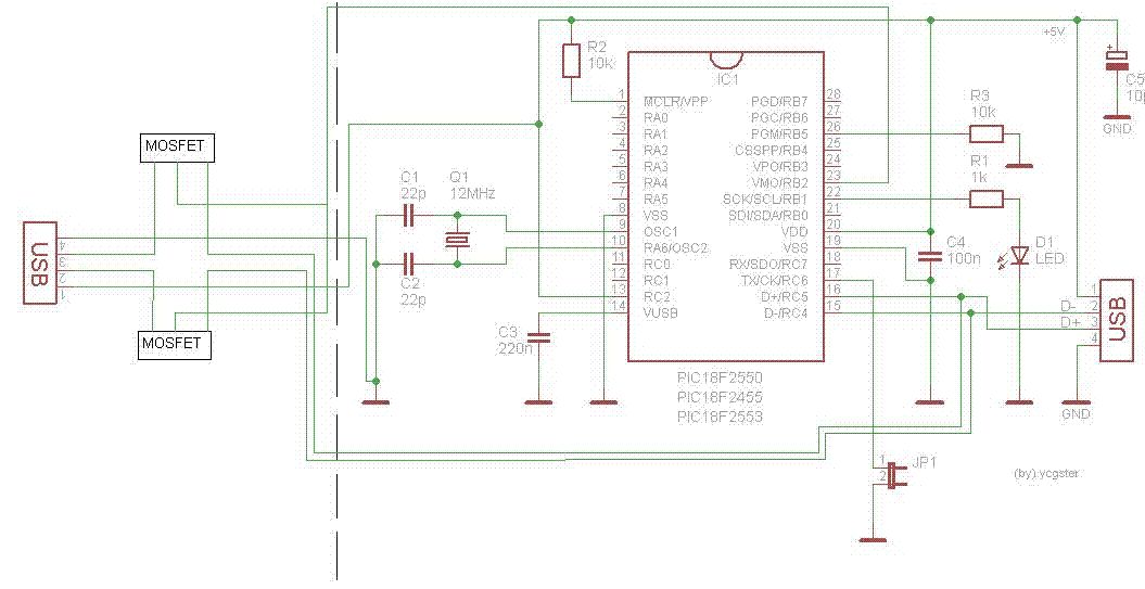 Hi mich interesiert etwas ähnliches, ich habe eine schaltung (siehe Bild, rechter teil ist nicht von mir). In der Schaltung befindet sich ein 18F2550, der am Anfang mit der Gegenstelle Komuniziert, irgendwann ist dieser fertig und sendet nichts mehr über die leitungen, sobald dieser zustand erreicht ist soll RB2 auf on (+5V) gestellt werden, dadurch sollen zwei MOSFET's geschalten werden (erst dachte ich an relais aber soweit ich das verstanden habe ist ein MOSFET fast das gleiche). Dadurch könnte nun das 2 Gerät Komunizieren. Nun stellen sich mir ein paar fragen auf die ich noch keine antwort weis: 1. Sind Mosfets überhaupt die richtige wahl? 2. Kann der 18F2550 an den Ports D-/+ dadurch geschädigt werden? 3. Sollte ich die 5V leitung zum 2 Gerät auch unterbrechen? 4. Welche Mosfets brauch ich da dann, Conrad hat ja ü 100 im angebot! Gruß Pascal