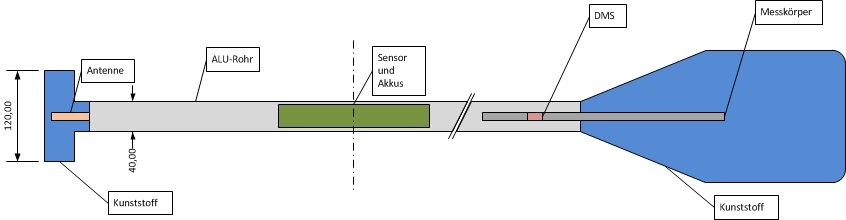 Da endlich eine Skizze vorliegt, ist es möglich, eine sinnvolle Antwort zu geben. Praktikabel wäre es, im Rohr des Paddels eine Koax-Leitung bis in das Kunststoff-Teil hineinzuführen. Der Mantel der Koaxleitung endet also am Rande des Rohres, der Innenleiter reicht in den Kunststoff hinein. Das aus dem Koax in den Kunststoff hineinragende Teil sollte möglichst lambda viertel haben, das geht aber nicht. Abhilfen: die verkürzte Länge in Form einer Wendel "lang schummeln". Also einen lambdaviertel- Draht als Wendel zusammen biegen, sodass der in diese Länge passt. anders ginge es auch: Eine runde Scheibe ans Ende des kurzen Stabes, die wirkt als "Dachkapazität" und gleicht die fehlende Länge aus. in beiden Fällen muss Resonanz der Antenne erzielt werden, was mit einfachen Messmitteln schlecht zu prüfen ist. Probieren kann vielleicht die Lösung bringen: welche Scheibengröße oder welcher zur Wendel gebogene Draht bringt größte Reichweite? Damit bringt man die Antenne in Resonanz, sodass der Sender keine Blindleistung bringen muss, natürlich ist die Abstrahlung trotzdem um so schlechter je krasser die Stablänge von lambdaviertel abweicht. Bei der Wahl des Kunststoffs gibt es ein zusätzliches Problem: Viele Kunststoffe sind gute Absorber bei 433MHz, Wenn man Pech hat, gibts keine Abstrahlung.