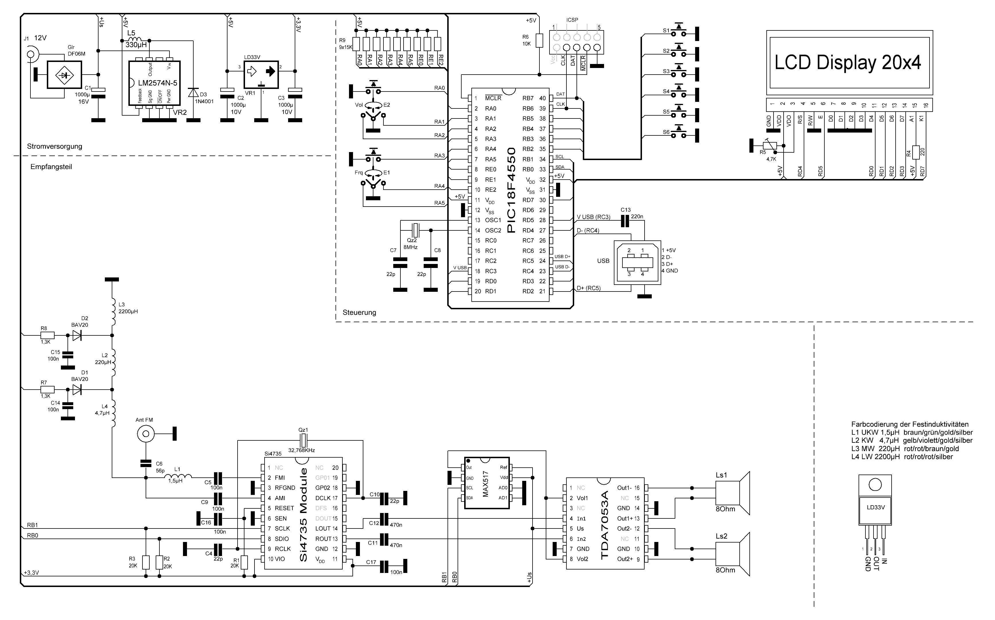Hallo Christian, Du könntest folgendes Display verwenden: http://www.reichelt.de/?ACTION=3;GROUP=A5213;GROUPID=3007;ARTICLE=77843; und dann einfach die komplette Schaltung mit 3.3V betreiben. Der Mega läuft dann allerdings nur mit reduziertem Takt. In der Schaltung von Stefan Lehnert wird übrigens eine (nicht ganz so elegante) Pegelwandlung verwendet (über die Widerstände in den Datenleitungen). Die Pegelwandlung wird auf jeden Fall benötigt, denn leider kann man den si4735 zwar mit 5V speisen, die Supplyspannung muss aber <= 3.6V liegen. Gruß Daniel
