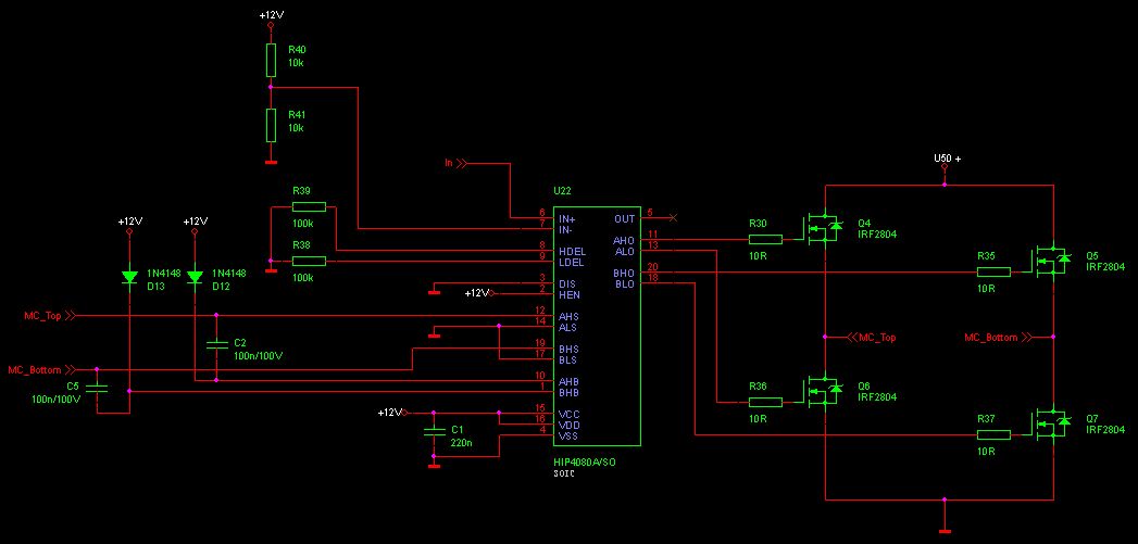 1. Korrektur: Bi ms 14 soll Bei ms 14 heißen 2. Zusätze: - Getrennte GNDs für Digital und Power. Diese nur an einem Punkt verbinden, und zwar genau am HIP. - Alle Leitungen Leiterbahnen so dick breit wie möglich, um deren Impedanz niedrig zu halten. - natürlich bekommt der HIP ebenfalls einen eigenen Abblock-C und eine 12V-Suppressor-Diode. - ich empfehle parallel zu den intrinsic body dioden zusätzliche Schottkys. 3. poste bitte ein gutes Foto vom Aufbau. 4. Nenne die Eckdaten (Spannung, Durchschnitts-Strom, max. Strom, Frequenz, Art der Last, Serienprodukt?).