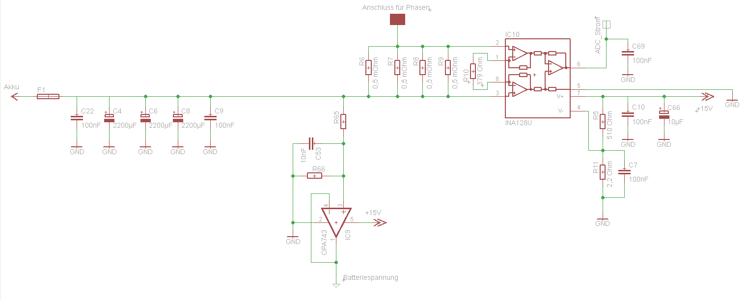 den oberen beitrag kann ich blöderweiße nicht mehr löschen Ich arbeite mich jetzt von Anfang bis Ende durch. Als erstes brauch ich eine Spannungsversorgung und eine Strommessung. Die Strommessung könnte ich auch induktiv machen, allerdings hab ich so schön kleine SMD Widerstände mit 0,5m Ohm, die sich hervorragend als Shunt eignen. Die 470µF dienen als Energiespeicher, die 100nF sollten hohe Frequenzen unterdrücken, wobei ich mich ehrlich frage ob das überhaupt da so sinnvoll ist. Der INA128 verstärkt wie ich schon geschrieben hab das Signal um den Faktor 132. R66 und R65 bilden wieder den Spannungsteiler für die 3,3V, der Operationsverstärker soll als Impedanzwandler arbeiten, ich weiß viele sagen, dass es eigentlich unnötig ist, ich würde ihn aber trotzdem sehr gerne drinne haben.