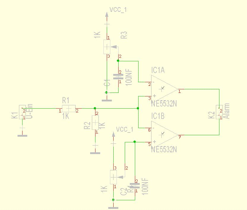 Kann mich der Aussage von 'AS' nur anschließen: Unbedingt Komparatoren verwenden und definitiv keine normalen OpAmps. Ferner stellt sich mir die Frage, warum Du den Alarmausgang zwischen den Ausgängen der beiden (Pseudo-)Komparatoren eingezeichnet hast?!?! Uffbasse(!): Wenn Du denn dann richtige Komparatoren einsetzen solltest, achte darauf wie ihre Ausgänge funktionieren, denn i.d.R. sind das dann 'Open-Collector'-Ausgänge, die (üblicherweise) einen externen Arbeitswiderstand nach Vcc brauchen. Aber so lassen sie sich auch besser wiredOR-mäßig verschalten.