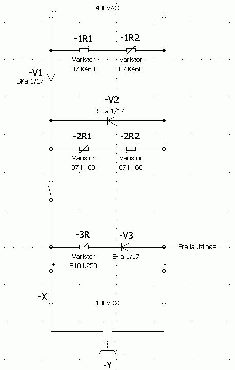 Hallo, bin neu hier im Forum, hier meine erste Frage: Die angehängte Schaltung zeigt eine Bremsgelichrichter. Die Funktion der Freilaufdiode ist klar, aber was macht der Varistor -3R ? Kann mich da wer aufklären ? Viele Grüße bruno