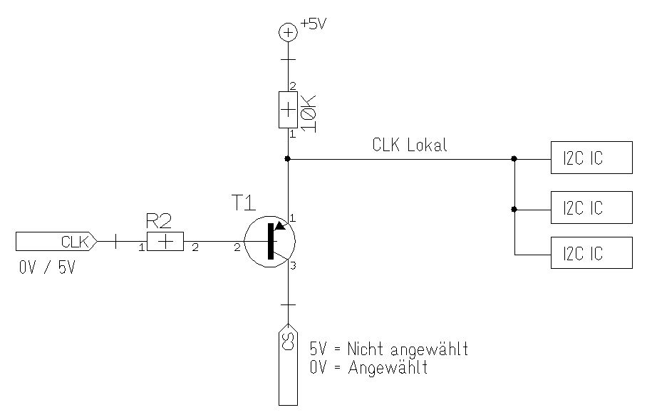 Hi zusammen, ich habe eine Schaltung, die aus 10 gleichen Platinen besteht. Auf jeder Platine sind 4 I2C-Chips. Da einige IC's leider nur feste Adressen haben, würde ich den Bus gerne "umschalten". D.h. ich möchte mit einem CS-Signal die jeweilige Platine anwählen und dort mit den einzelnen IC's kommunizieren. Dazu habe ich mir ausgedacht, daß ich einfach nur den Takt für die jeweils angewählte Platine "einschalte". - Was haltet Ihr von dem Konzept? - Was haltet Ihr von der Schaltung im Anhang? P.S. Die "globale Clock" wäre dann kein open-collector, sondern ein einfaches 0V / 5V-Signal für die angehängte Schaltung. Die Pull-ups wären jeweils auf den Platinen. Danke für Eure Meinung!