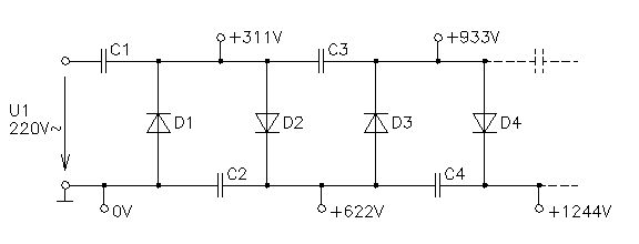 Eine Kaskadenschaltung zur Spannungsvervielfachung.