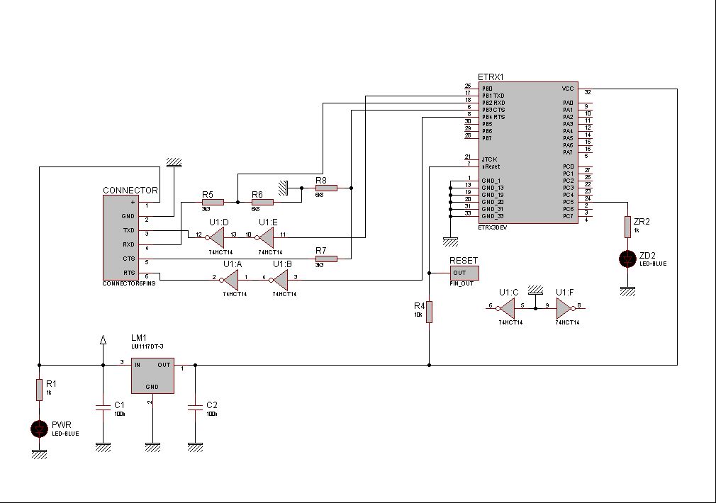 Hallo, ich habe ein Problem mit dem ETRX3 Modul. Ich habe das Modul über einen Pegelwandler(Max232) am PC angeschlossen.(Zumindest ohne CTS/RTS funktioniert diese Verbindung mit einem alten Bluetooth Modul wunderbar) Wenn ich nun versuche darauf über ein Terminalprogramm zuzugreifen, kriege ich einfach keine Antwort. Eine angeschlossene LED am rxd port des modules blinkt zwar fröhlich, aber es sendet nichts. Ich habe das Modul nach dem beigefügten Schaltplan angeschlossen, weil ich es mit 5 Volt betreiben möchte. Ich weiß einfach nicht mehr weiter... Viele Dank im Voraus Michael