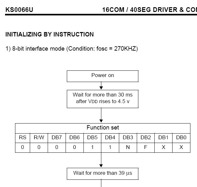 Das Problem kenne ich gut, habe es beim TC1602A gerade gelöst. Selbst dann suchte ich noch 3 Tage nach einem Fehler, der in den Ausführungszeiten eines Befehls begründet war. Mir ist es erst gelungen als ich eine Spec meines Displays gefunden hatte. Beitrag "LCD TC1602 Initialisierung" Beitrag "kurze Frage zu TC1602A Initialisierung via t2313" Ich habe nicht die Befehle_Spec. incl. der Ausführungszeiten von deinem Display/Controller gefunden. Hast du die schon? http://www.eio.com/p-939-orient-display-amc2004a-b-b6wtdw-4x20-character-lcd-display-module.aspx Da ist was ähnliches vielleicht. Die Init ist genau beschrieben. Lass mich wissen, wenn du so was für den KS0066 Controller gefunden hast. LG Rudi