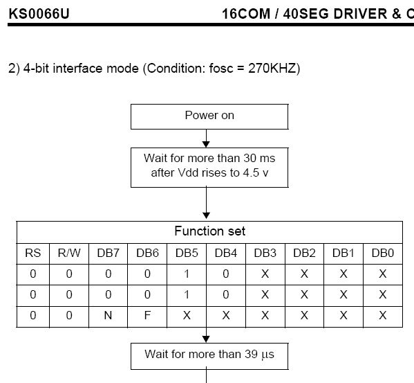 Hi Im Datenblatt vom KS0066 steht die Initialisierung für 4Bit-Mode drin. einfach nachsehen und vergleichen. MfG Spess