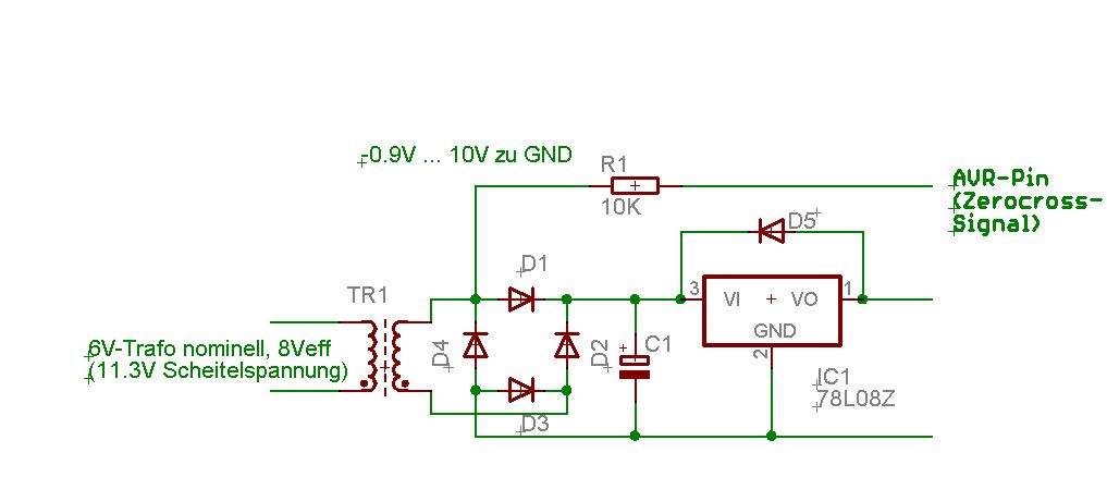 Ganz allgemein, die Spannung hinter dem Spannungsregler ist IMMER höher als 5V. Ich verweise ganz dezent auf dessen Namen 78L08. Würd da kein AVR direkt anschließen, da sonst sehr schnell der magische Rauch aus dem Chip entweicht. Wegen dem zero-Corssing detector. Für die ganz ängstlichen (mich zB) gibt es ja noch immer die 5V Zener Diode. Damit kann man dann auch ruhiger schlafen, im Wissen, dass man nicht auf die Klemmdioden vertrauen muss. gruß Mobius
