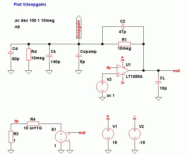 Der Phasengang, der hier interessiert, ist der zwischen idealisiertem Ausgang des OPamps, also vor der Open-Loop-Ausgangsimpedanz, und invertierendem Eingang des OPamps. Das simulierst du so, wie im Anhang. Der OPamp kommt hierbei garnicht mehr vor, sondern wird hier mit seiner Ausgangsimpedanz (300R für einen TL072) und seiner Kapazität vom invertierenden Eingang nach Masse (rund 20pF für einen TL072, die in der 200pF Kapazität schon enthalten sind) simuliert. Bei einem Gegenkopplungswiderstand von 10M sollte der Cap in der Gegekopplung also rund 47pF betragen. Kai Klaas