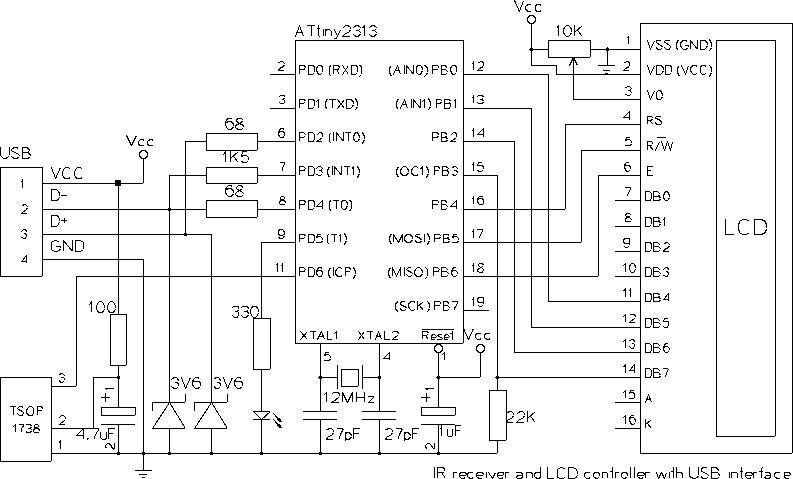 Hallo Ich habe hier eine Schaltung gefunden die ich nachbauen möchte und habe dazu folgende Fragen. Statt den zwei Kondensatoren mit 27pf kann ich da auch 22pF nehmen? Ich nehme an das das zwei Z-Dioden sind? Und der ATTiny2313 hat noch keine GND und Vss bekommen? Danke Mario