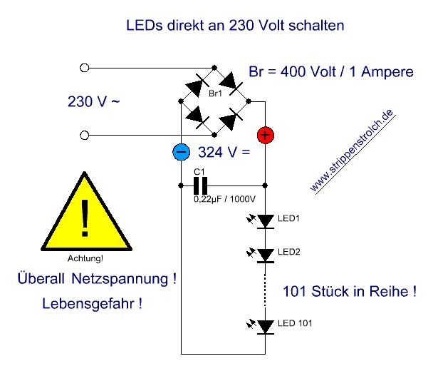 Hi, Auf http://bastelmolch.ba.funpic.de/licht.HTM ungefähr in der Mitte ist so eine Schaltung für LED an 230V. Pass aber auf dass du dich - und andere - nicht umbringst! Alles muss ABSOLUT BERÜHRUNGSSICHER eingebaut sein!! Nimm besser ein billiges 24V Schaltnetzteil und mach x Reihen (mit jeweils 6 LED in Reihe + einen 270 Ohm Widerstand). lg Triti