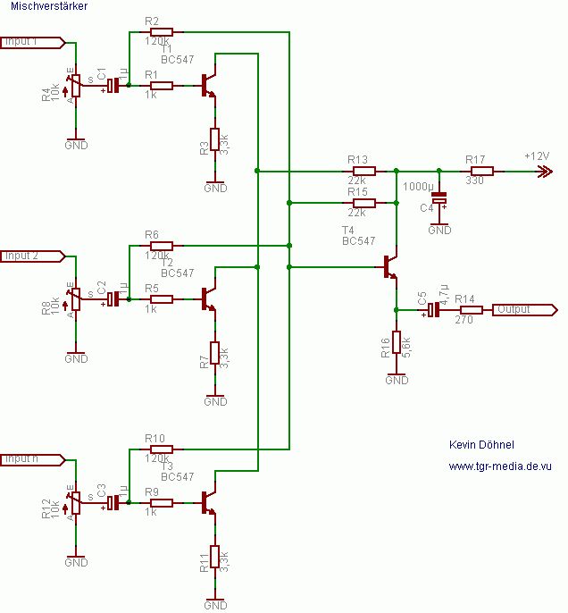 Wie ist es möglich mit wenigen bauteilen ein 2-Kanal Streo Mischpult zu bauen?? (Lautstärkeregeler für Kanal1, Kanal2 und Master)