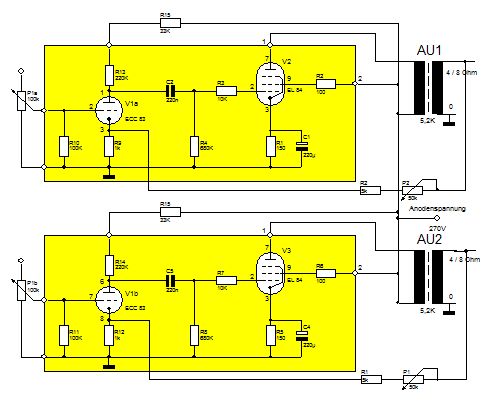 Hallo zusammen, ich stehe im Moment vor einem Problem bei dem ich mir keinen Rat mehr weiss... Folgende Thematik, das im Bild gezeigte geregelte Netzteil wird mit 370V AC befeuert. Liefern soll es ca. 100mA bei 220V DC (2 x EL84 und einmal ECC83). Im unbelasteten Zustand, habe ich max. 2mV Rauschen auf der Gleichspannungsseite. Ist also in Ordnung!!! So, jetzt belaste ich das Netzteil, nur mit der ECC83 einwandfrei, es bleibt beim Rauschen von 2mV. Stecke ich die erste EL84 in die Schaltung fällt die Spannung auf ca. 120V ab und die ganze Schaltung brummt. Gehe ich jetzt mit dem Scope an den Drain, Masse des Scope ist identisch mit der Gesamtmasse des Verstärkers ist das Brummen weg, die Spannung bleibt auf ca. 120V stehen. Stecke ich jetzt die zweite EL84 in die Schaltung, bricht mir die Spannung auf ca. 19V ein und ausser Brummen kommt da gar nichts mehr. Was auch verständlich ist bei 19V Anodenspannung. Schaue ich mir jetzt mit dem Scope das Spannungssignal in der Einstellung AC an, habe ich einen Sägezahn von ca. 4Vss auf der Leitung anliegen. Meine Frage jetzt, warum bricht die Spannung ein, wenn die ganze Schaltung ca. 100 mA abnimmt. Den Strom habe ich gemessen. An den Katodenwiderständen fällt ebenfalls die korrekte Spannung ab, was bedeutet, dass die EL84 mit ca. 48mA betrieben wird. Was ist da los? Ich bekomme es einfach nicht auf die Reihe. Kann jemand helfen? Beide Schaltungen habe ich angehangen. Alle Bauteile wurden von mir mehrfach durchgemessen und auf korrekte Werte gepürft. Das ganze wird auf einer geätzten Platine und schon mehrfach im Einsatz befindlichen Platine aufgebaut. Bisher habe ich eine RCR-Siebung verwendet. Jetzt wollte ich nur mal so ein geregeltes Netzteil testen und ausprobieren und bekomme echt die Kriese. Vielen Dank für jede Idee. Gruß Tubeman