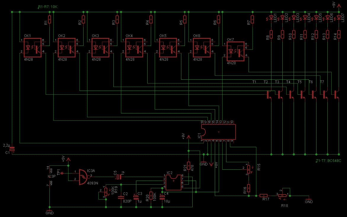 Wozu die ganzen Optokoppler, nur zur Pegelverschiebung? Der IC1 kann direkt die Transistoren treiben. Wenn du z.B. BC557 mit Basiswiderständen nimmst und die LEDs nach Masse legst, können die Optokoppler entfallen.