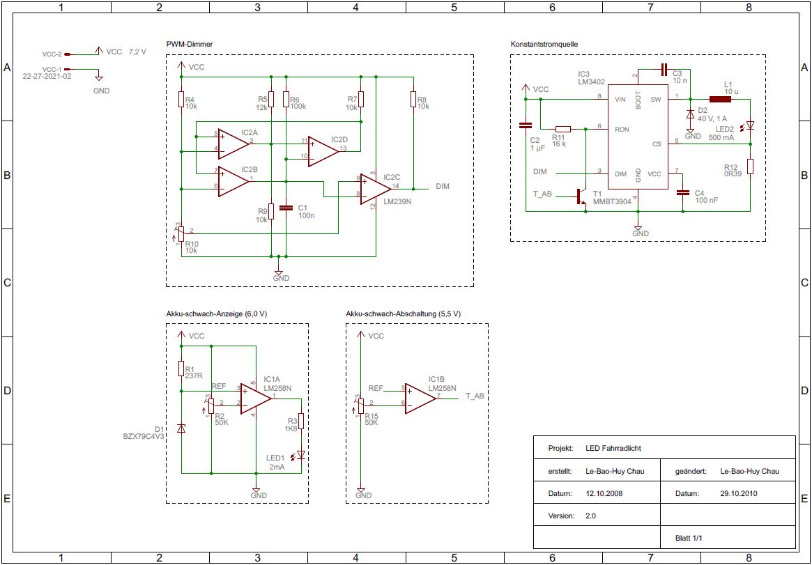 Hallo, ich würde gerne eine dimmbare Konstantstromquelle zum Betreiben einer 500 mA LED basteln. Die Schaltung wird mit 4 LiOn Akkus betrieben, je zwei in Reihe und dann parallel geschalten (7,2 V, 2 Ah). Hab in die Schaltung noch eine Akkuschwach-Warnung und eine automatische Abschaltung eingebaut. Könntet ihr mal kurz drüber schaun, ob das so passt? Den PWM Dimmer hab ich von led-treiber übernommen, die Beschaltung des LM3402 ausm Datenblatt berechnet. Danke!