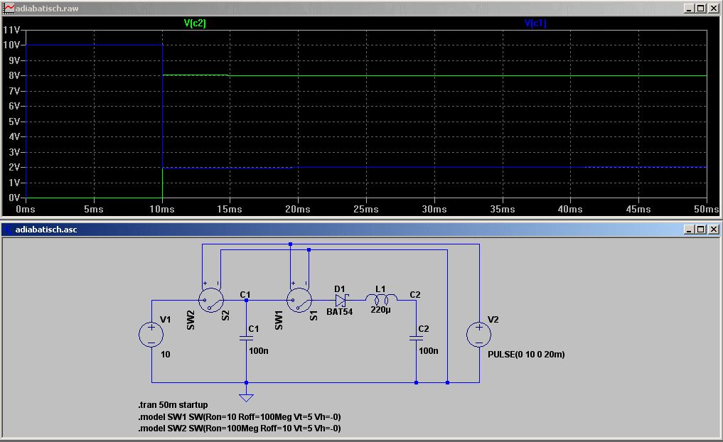 Hier die Simulation nach dem Vorschlag von eProfi. Mit einer Spule aus der Bastelkiste (220 µH, 5 Ohm) werden statt 25 %, 64 % der Energie in den 2. Kondensator übertragen (4 % der Energie verbleiben im 1. Kondensator, 32 % werden "verheizt"). Mit einer "besseren" Spule im mH-Bereich kommt man auf über 80 %.
