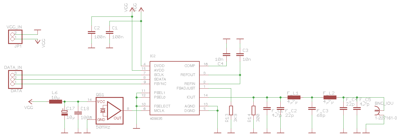 Hallo brandic, ja, ich habe das Filter mit 300R abgeschlossen, siehe Anhang. Von der Buchse muss ich ja nun irgendwie das Ausgangsignal messen, und habe dafür verschiedenen Möglichkeiten 1. Hameg 203-5 analog 20MHZ : nach Augenschein gutes Ergebnis, hätte ich nur dieses Scope, hätte ich keine Zweifel gehabt ;-) 2. Tek TDS784C 1GHZ, Messung mit Tastkopf 6139 und keiner/250MHZ Bandbreitenbregenzung : augenscheinlich schlechtes Ergebnis, siehe Bilder weiter oben. 3. Tek TDS784C 1GHZ,RG58 BNC direkt von der Augangsbuchse der Platine auf das Scope, augenscheinlich bedeutend besser. Ich habe drei mal augenscheinlich geschrieben, da ich ja nicht weiss ob das Signal wirklich besser/schlechter ist, oder ob es am Messverfahren liegt. Viele der Vorschläge aus dem Forum wie - getrennte Massen - getrennte Versorgungspannungen - SMD HF-Spulen, SMD Kondensatoren ( bis auf den 10n) - 300R Abschluss - Quarz näher an den DDS chip sind in diesen 2. Prototypen eingeflossen und das Ergebnis sieht ja nun auch schon einiges besser aus. Bei diesem Projekt habe ich bewußt versucht modular zu bleiben um meine Erfahrungen zu machen und um Vorschläge aus dem Forum einarbeiten zu könnnen. Platz für die Endstufe wäre ja nun auf der Platine mit Sicherheit noch gewesen, aber je mehr darauf ist, umso schwerer tue ich mich den Fehler einzugrenzen und nochmals neu anzufangen. Bei den paar Bauteilen habe ich ruckzuck eine neue Platine angefertigt. bis dann, Frank