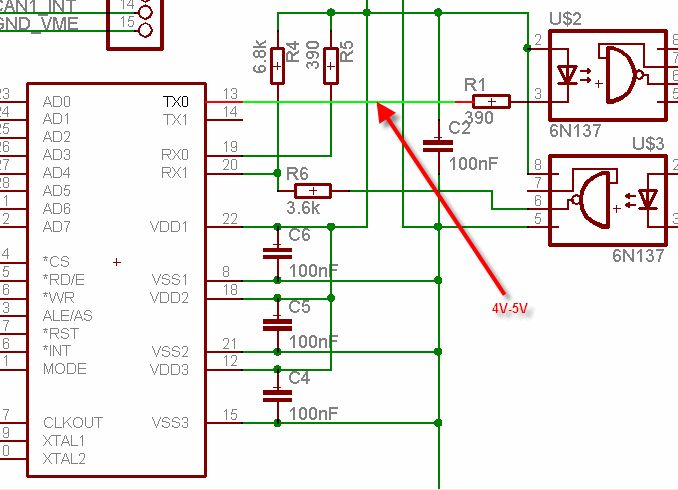 Hallo Ich habe den SJA 1000 entfernt, und dann an der TX0-Leitung gemessen: 4Volt. Scheint mir plausibel: Durch das Messen ensteht ein kleiner Strom, der zu einem Spannungsabfall in der im Optokoppler eingebauten Diode führt (siehe Anhang). Kann das bedeuten, dass die Ausgangsstufe nach Masse des SJA1000 nicht richtig durchschaltet ? (Ich habe ein Diagramm der Ausgangstufe angehängt) Danke Tilman